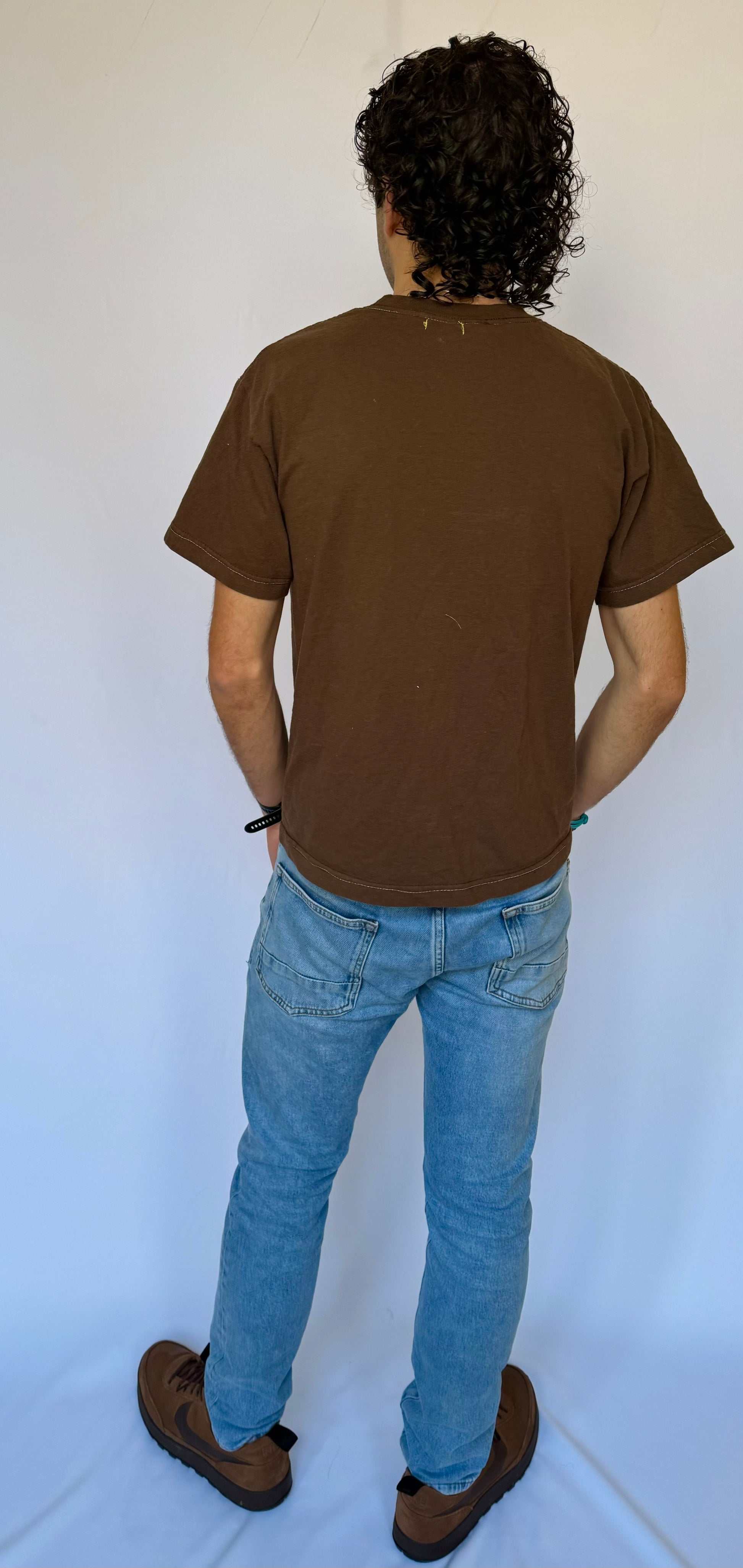 vintage Triumph patch repurposed onto tee with detailed stitching.